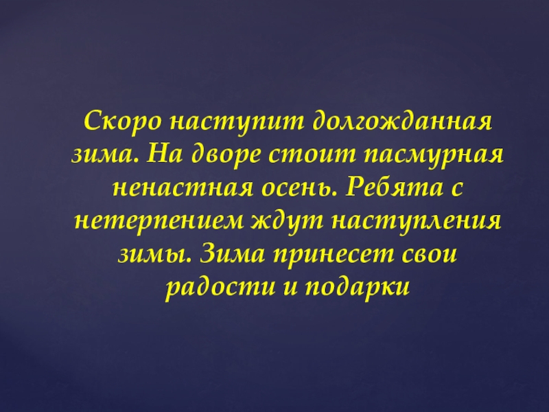 Скоро наступит долгожданная зима. На дворе стоит пасмурная ненастная осень. Ребята с нетерпением ждут наступления зимы. Зима