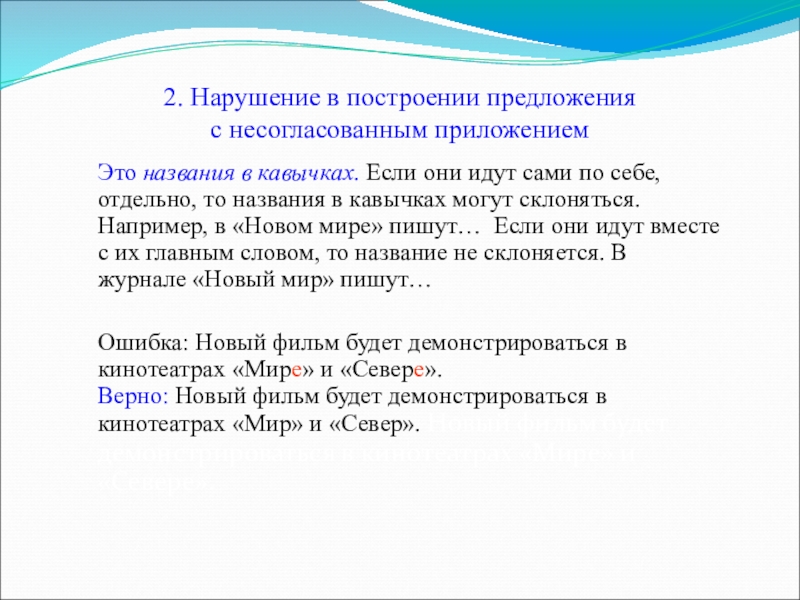 - нарушение в построении предложения с несогласованным приложением;