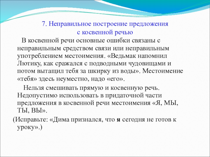 основные ошибки связаны с неправильным средством связи или неправильным употреблением местоимения. «Ведьмак напомнил Лютику, как сражался с подводными чудовищами и потом вытащил тебя за шкирку из воды». Местоимение «тебя» здесь неуместно, надо «его».