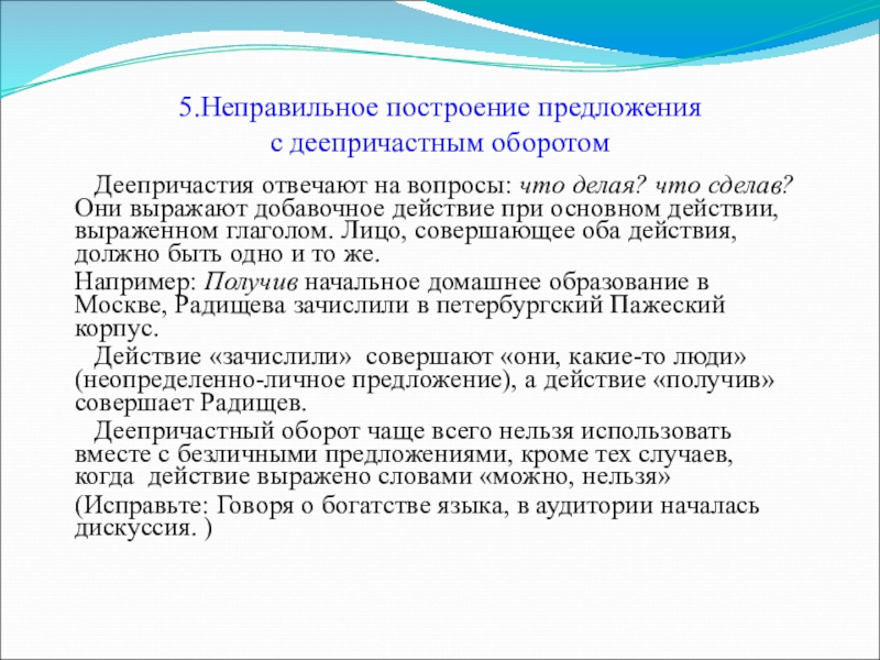 - неправильное построение предложения с деепричастным оборотом;