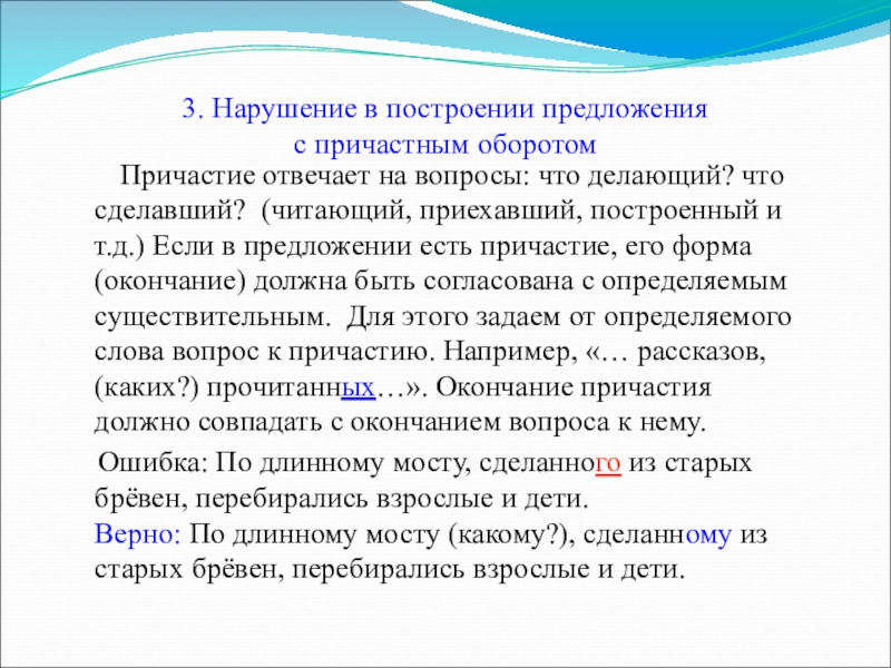 - нарушение в построении предложения с причастным оборотом;
