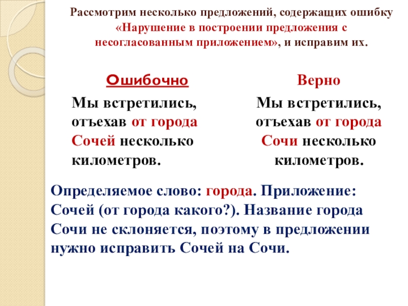 Определяемое слово: города. Приложение: Сочей (от города какого?). Название города Сочи не склоняется, поэтому в предложении нужно исправить Сочей на Сочи.