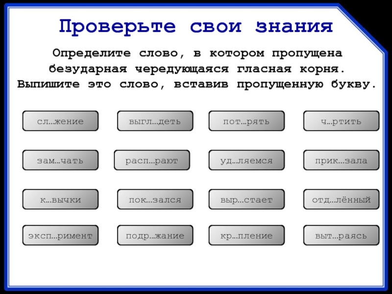 Определите слово, в котором пропущена чередующаяся гласная корня. Выпишите это слово, вставив пропущенную букву.