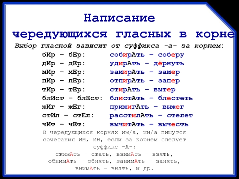 В чередующихся корнях им/а, ин/а пишутся сочетания ИМ, ИН, если за корнем следует суффикс -А-: