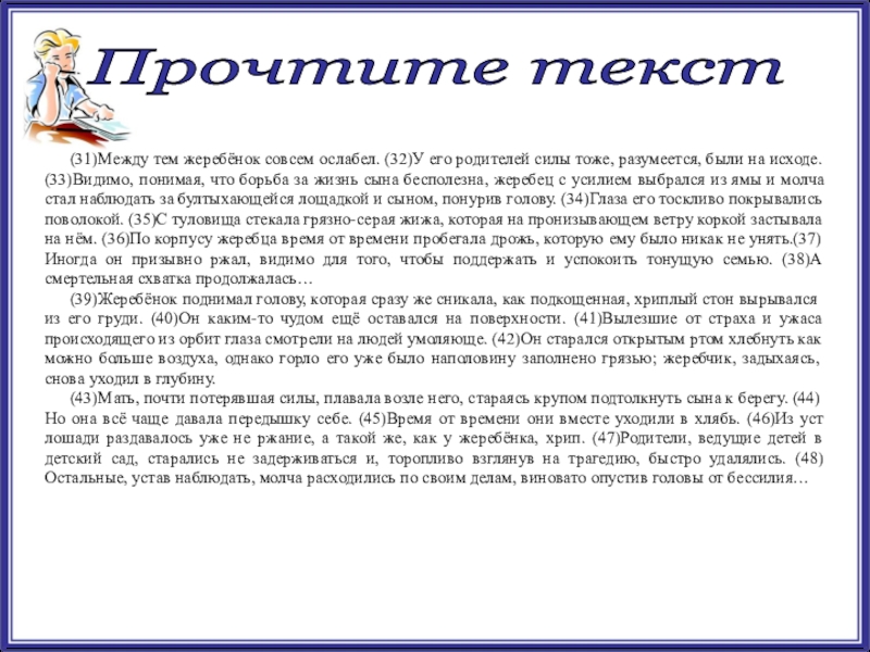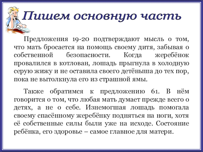 Также обратимся к предложению 61. В нём говорится о том, что любая мать думает прежде всего о детях, а не о себе. Изнемогшая лошадь помогала своему спасённому жеребёнку подняться на ноги, хотя её собственные силы были уже на исходе. Состояние ребёнка, его здоровье – самое главное для матери.