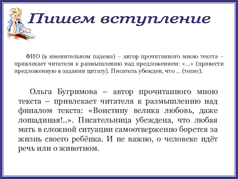 ФИО (в именительном падеже) – автор прочитанного мною текста – привлекает читателя к размышлению над предложением: «…» (привести предложенную в задании цитату). Писатель убежден, что … (тезис).