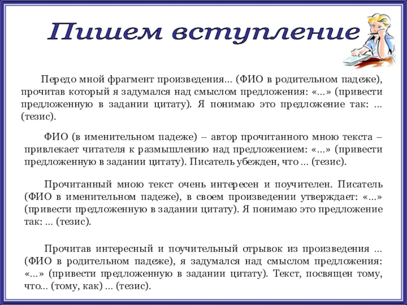 Прочитав интересный и поучительный отрывок из произведения … (ФИО в родительном падеже), я задумался над смыслом предложения: «…» (привести предложенную в задании цитату). Текст, посвящен тому, что… (тому, как) … (тезис).