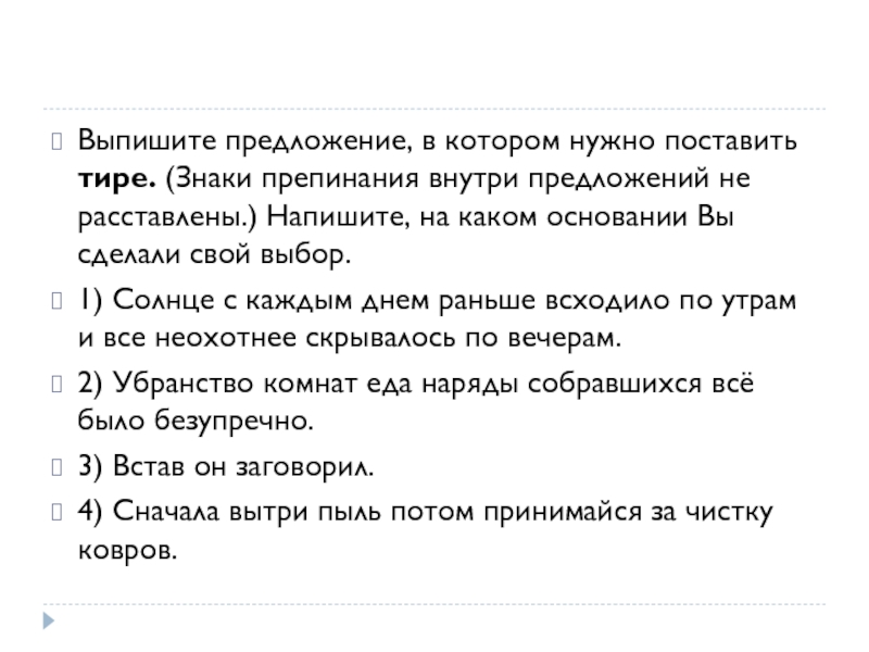 Слайд 7Выпишите предложение, в котором нужно поставить тире. (Знаки препинания внутри предложений