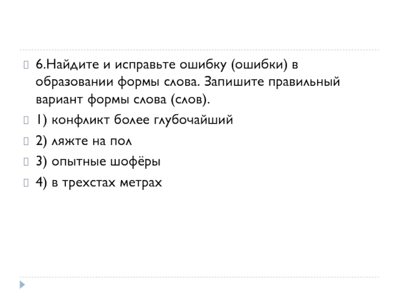 6.Найдите и исправьте ошибку (ошибки) в образовании формы слова. Запишите правильный вариант формы слова (слов).1) конфликт более