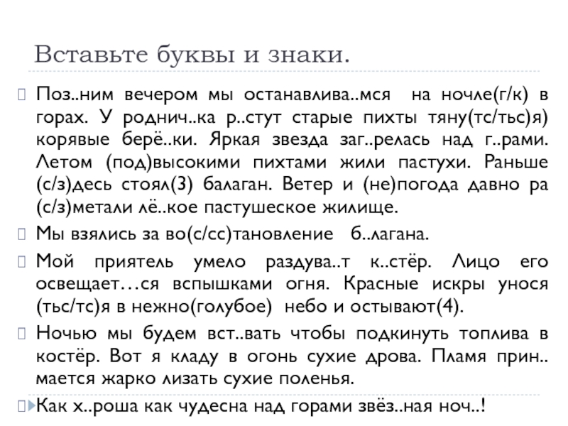 Вставьте буквы и знаки.Поз..ним вечером мы останавлива..мся на ночле(г/к) в горах. У роднич..ка р..стут старые пихты тяну(тс/тьс)я) корявые берё..ки. Яркая звезда заг..релась над г..рами. Летом (под)высокими пихтами жили пастухи. Раньше (с/з)десь стоял(3) балаган. Ветер и (не)погода