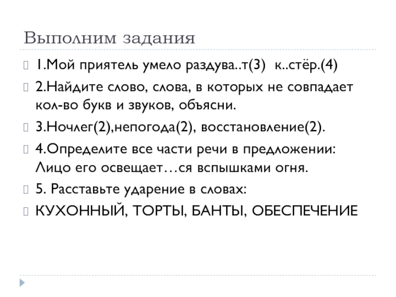 Выполним задания1.Мой приятель умело раздува..т(3) к..стёр.(4)2.Найдите слово, слова, в которых не совпадает кол-во букв и звуков, объясни.3.Ночлег(2),непогода(2),