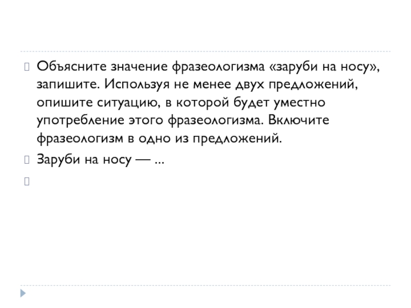 Слайд 8Объясните значение фразеологизма «заруби на носу», запишите. Используя не менее двух