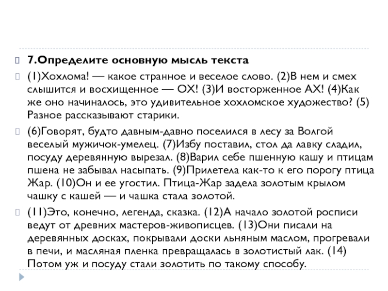 7.Определите основную мысль текста(1)Хохлома! — какое странное и веселое слово. (2)В нем и смех слышится и восхищенное — ОХ!