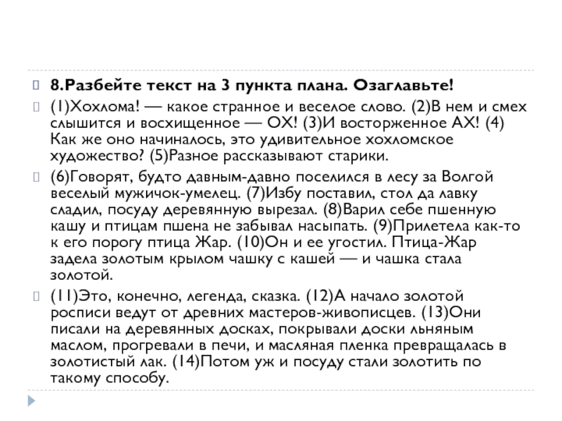 8.Разбейте текст на 3 пункта плана. Озаглавьте!(1)Хохлома! — какое странное и веселое слово. (2)В нем и смех слышится