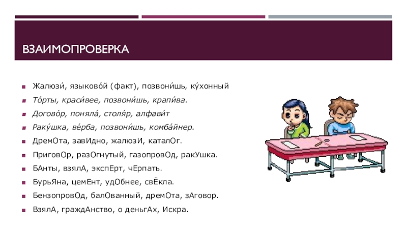 ВзаимопроверкаЖалюзи́, языково́й (факт), позвони́шь‚ ку́хонныйТо́рты, краси́вее, позвони́шь, крапи́ва.Догово́р, поняла́, столя́р, алфави́тРаку́шка, ве́рба, позвони́шь, комба́йнер.ДремОта, завИдно, жалюзИ, каталОг.ПриговОр,