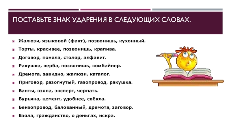 Поставьте знак ударения в следующих словах.  Жалюзи, языковой (факт), позвонишь, кухонный.Торты, красивее, позвонишь, крапива.Договор, поняла, столяр, алфавит.Ракушка, верба, позвонишь, комбайнер.Дремота, завидно, жалюзи, каталог.Приговор, разогнутый, газопровод, ракушка.Банты, взяла, эксперт, черпать.Бурьяна, цемент, удобнее, свёкла.Бензопровод, балованный, дремота, заговор.Взяла, гражданство,