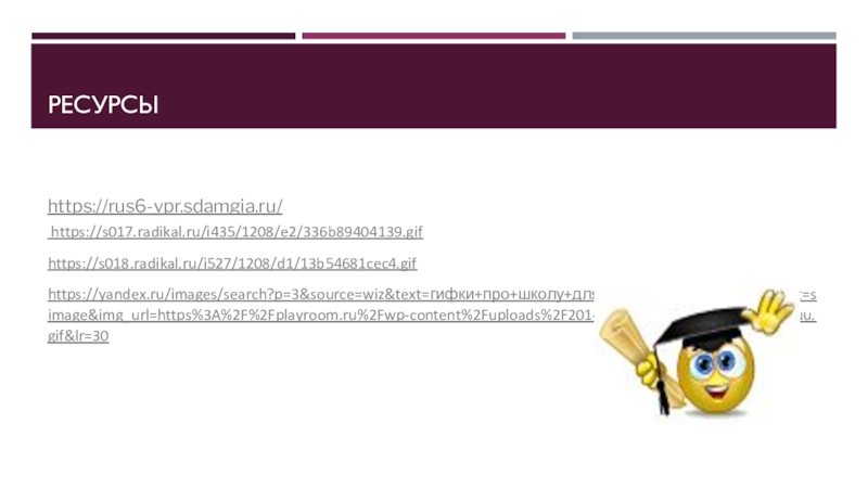 Ресурсыhttps://rus6-vpr.sdamgia.ru/ https://s017.radikal.ru/i435/1208/e2/336b89404139.gifhttps://s018.radikal.ru/i527/1208/d1/13b54681cec4.gifhttps://yandex.ru/images/search?p=3&source=wiz&text=гифки+про+школу+для+презентации&pos=168&rpt=simage&img_url=https%3A%2F%2Fplayroom.ru%2Fwp-content%2Fuploads%2F2014%2F09%2Fpodelki6_1384074uu.gif&lr=30
