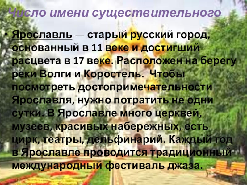 Число имени существительногоЯрославль — старый русский город, основанный в 11 веке и достигший расцвета в 17 веке. Расположен