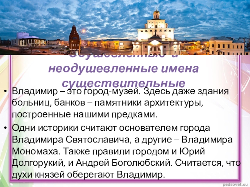 Одушевленные и неодушевленные имена существительныеВладимир – это город-музей. Здесь даже здания больниц, банков – памятники архитектуры, построенные