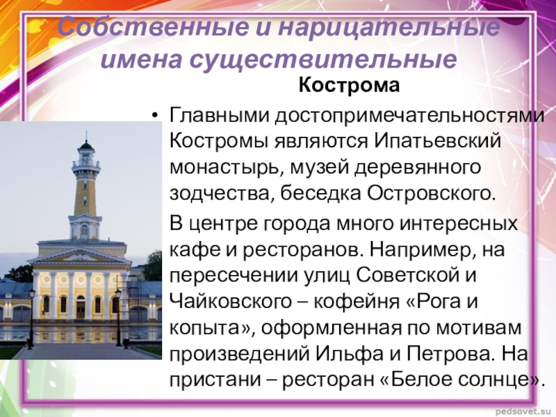 Собственные и нарицательные имена существительныеКострома Главными достопримечательностями Костромы являются Ипатьевский монастырь, музей деревянного зодчества, беседка Островского. В