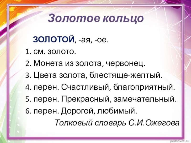 Золотое кольцо ЗОЛОТОЙ, -ая, -ое. 1. см. золото. 2. Монета из золота, червонец. 3. Цвета золота, блестяще-желтый. 4. перен. Счастливый, благоприятный. 5. перен. Прекрасный, замечательный. 6. перен. Дорогой, любимый.Толковый словарь С.И.Ожегова