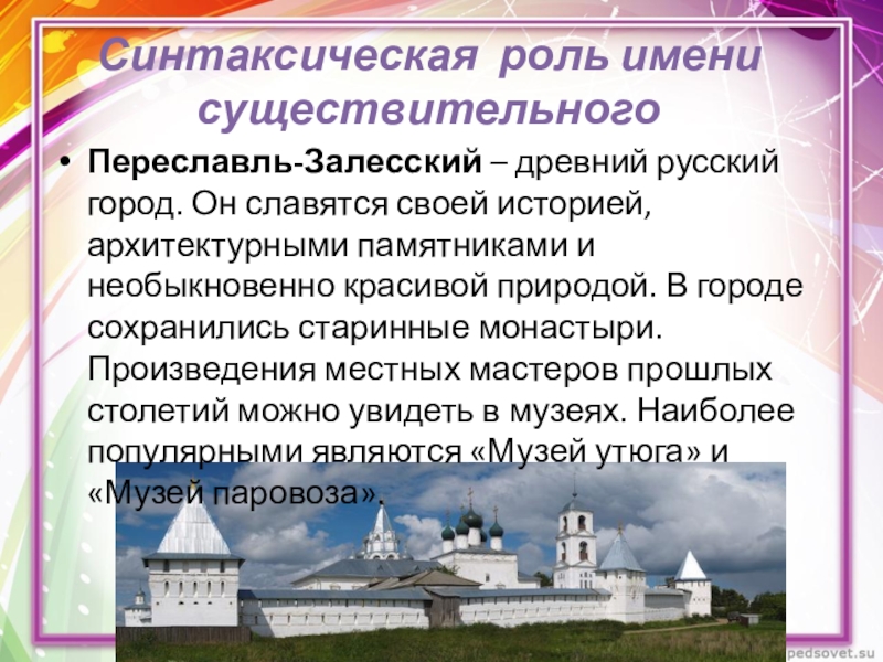 Синтаксическая роль имени существительногоПереславль-Залесский – древний русский город. Он славятся своей историей, архитектурными памятниками и необыкновенно красивой