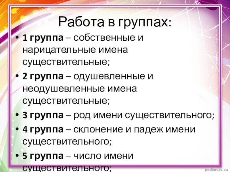 Работа в группах:1 группа – собственные и нарицательные имена существительные;2 группа – одушевленные и неодушевленные имена существительные;3