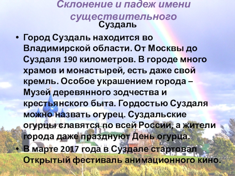 Склонение и падеж имени существительногоСуздаль Город Суздаль находится во Владимирской области. От Москвы до Суздаля 190 километров.