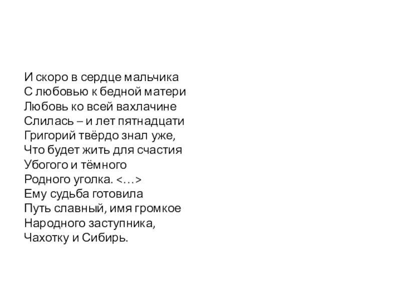 И скоро в сердце мальчика С любовью к бедной материЛюбовь ко всей вахлачинеСлилась – и лет пятнадцатиГригорий
