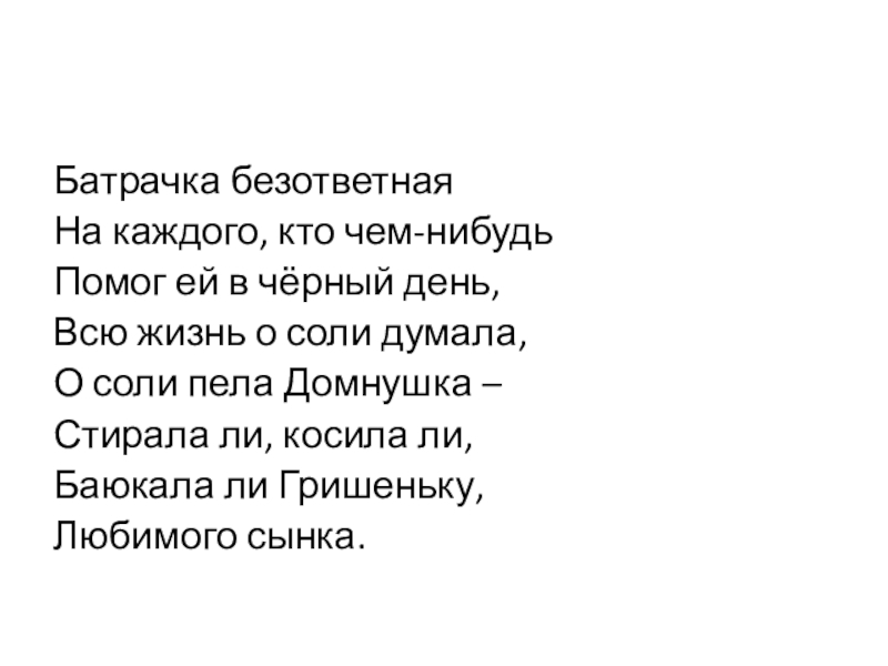 Батрачка безответнаяНа каждого, кто чем-нибудьПомог ей в чёрный день,Всю жизнь о соли думала,О соли пела Домнушка –