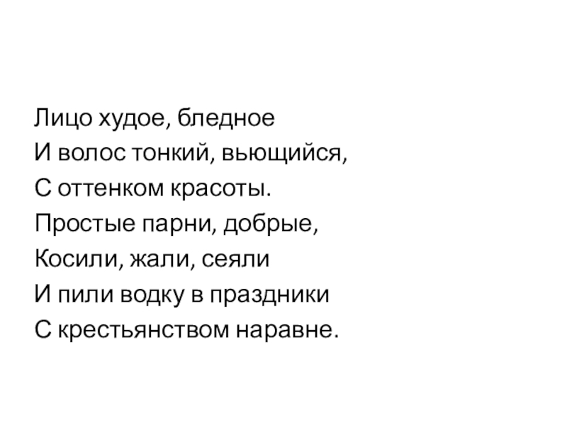Лицо худое, бледноеИ волос тонкий, вьющийся,С оттенком красоты.Простые парни, добрые,Косили, жали, сеялиИ пили водку в праздникиС крестьянством