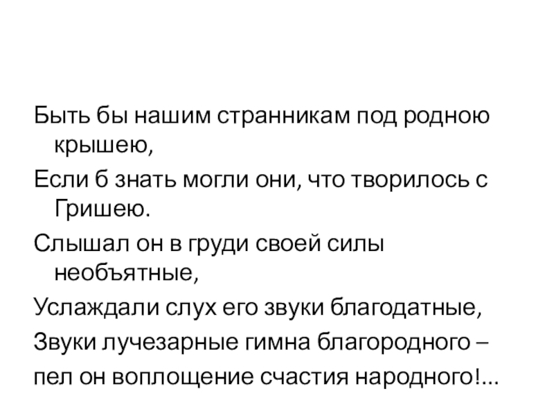 Быть бы нашим странникам под родною крышею,Если б знать могли они, что творилось с Гришею.Слышал он в