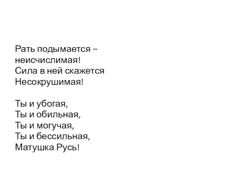 Рать подымается – неисчислимая!Сила в ней скажетсяНесокрушимая!Ты и убогая,Ты и обильная,Ты и могучая,Ты и бессильная,Матушка Русь!
