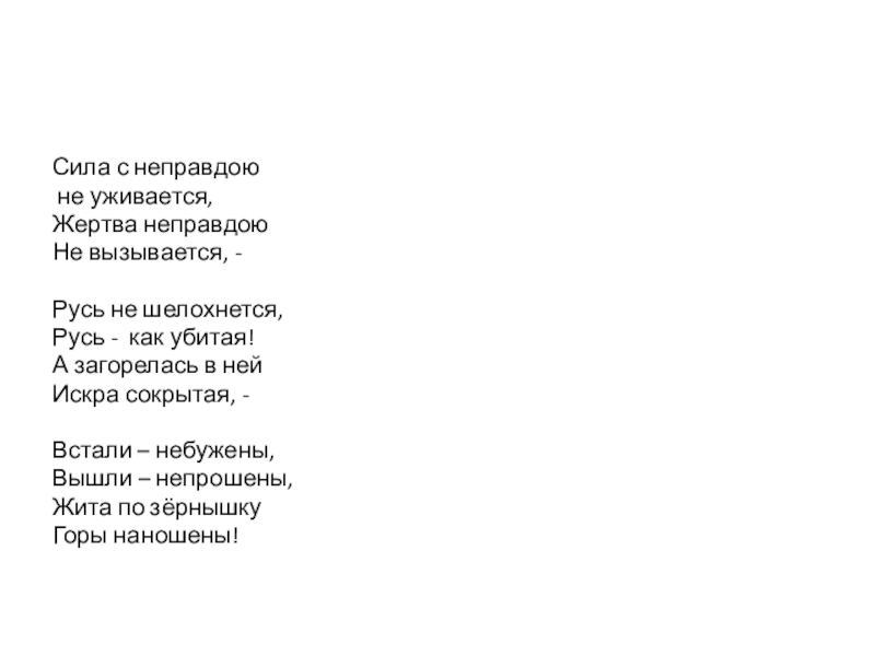 Сила с неправдою не уживается,Жертва неправдоюНе вызывается, - Русь не шелохнется,Русь - как убитая!А загорелась в нейИскра