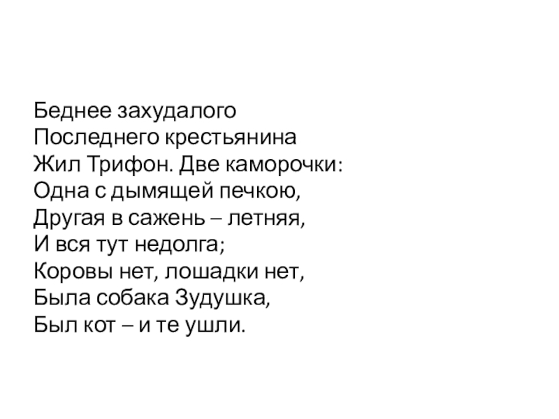 Беднее захудалого Последнего крестьянинаЖил Трифон. Две каморочки:Одна с дымящей печкою,Другая в сажень – летняя,И вся тут недолга;Коровы