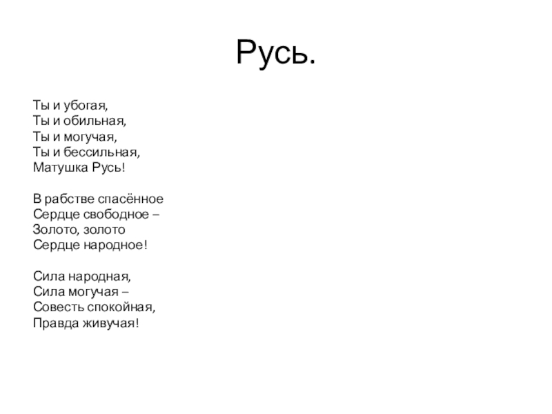 Русь.Ты и убогая,Ты и обильная,Ты и могучая,Ты и бессильная,Матушка Русь!В рабстве спасённоеСердце свободное – Золото, золотоСердце народное!Сила