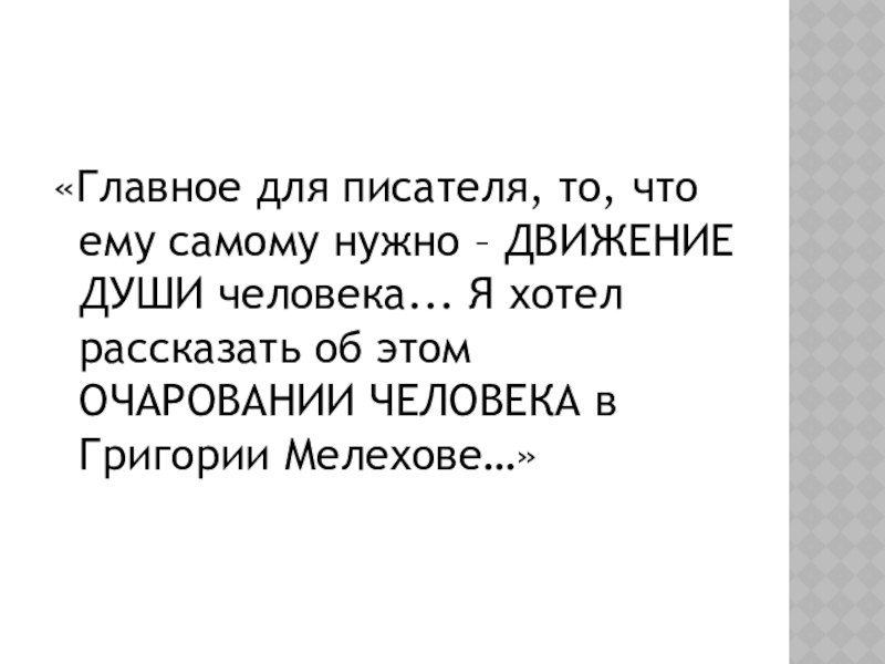 человека... Я хотел рассказать об этом ОЧАРОВАНИИ ЧЕЛОВЕКА в Григории Мелехове…»
