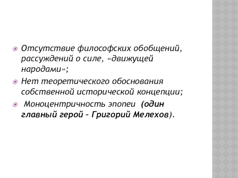 Слайд 4Отсутствие философских обобщений, рассуждений о силе, «движущей народами»;