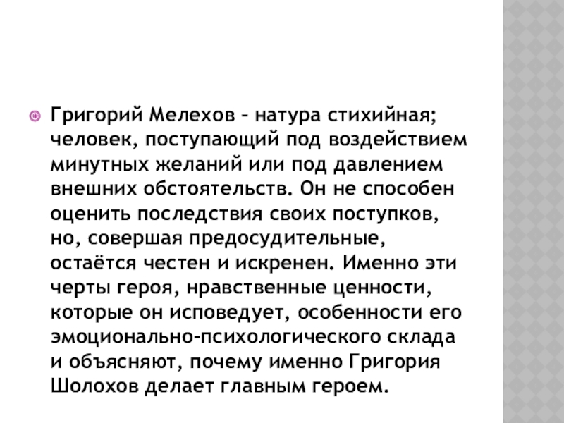 или под давлением внешних обстоятельств. Он не способен оценить последствия своих поступков, но, совершая предосудительные, остаётся честен и искренен. Именно эти черты героя, нравственные ценности, которые он исповедует, особенности его эмоционально-психологического склада и объясняют, почему именно Григория Шолохов делает главным героем.