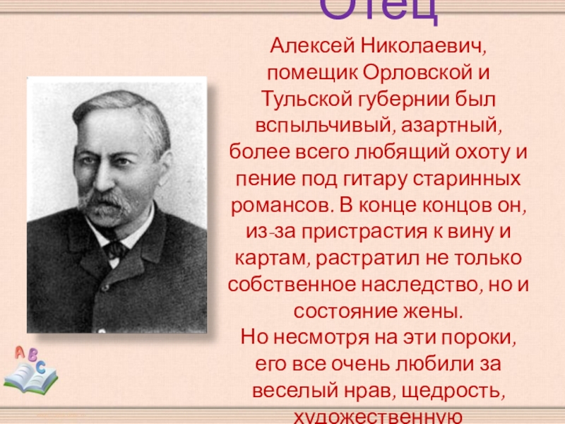 Алексей Николаевич, помещик Орловской и Тульской губернии был вспыльчивый, азартный, более