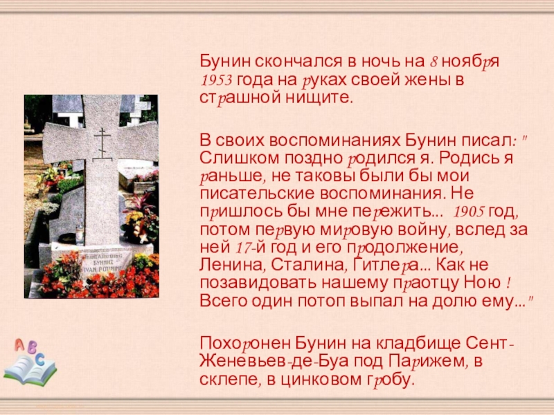 Похоpонен Бунин на кладбище Сент-Женевьев-де-Буа под Паpижем, в склепе, в цинковом гpобу.