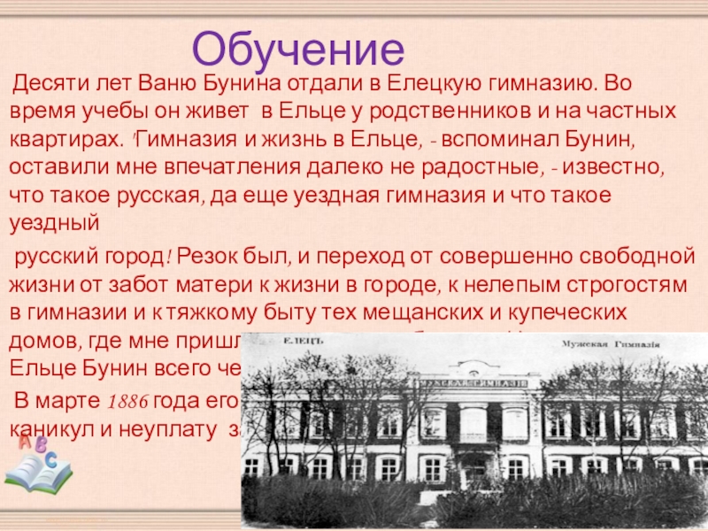 Десяти лет Ваню Бунина отдали в Елецкую гимназию. Во время