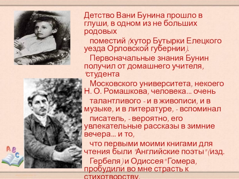 Первоначальные знания Бунин получил от домашнего учителя, "студента