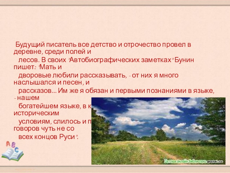 Слайд 11 Будущий писатель все детство и отрочество провел в деревне, среди