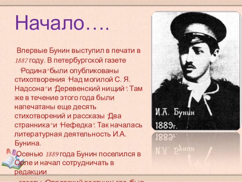 Впервые Бунин выступил в печати в 1887 году. В петербургской
