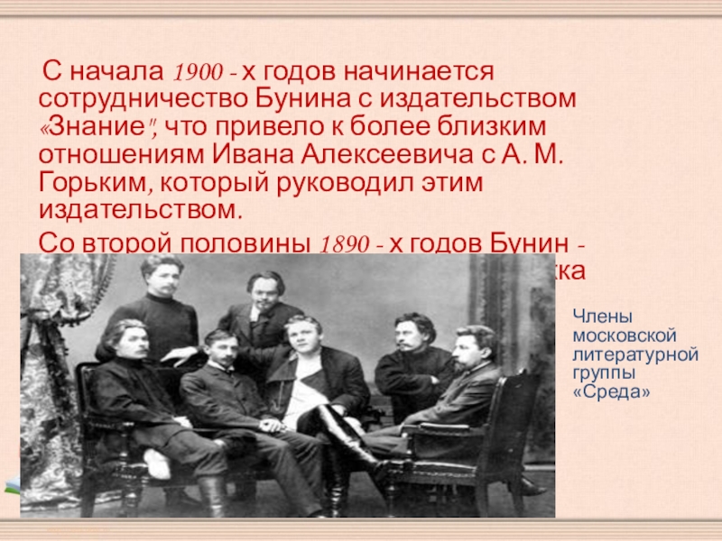 Со второй половины 1890 - х годов Бунин - активный участник литературного кружка "Среда"
