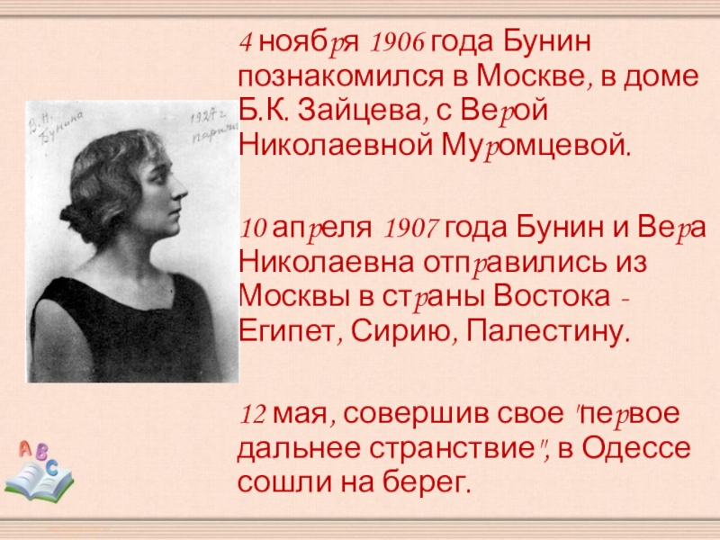 10 апpеля 1907 года Бунин и Веpа Николаевна отпpавились из Москвы в стpаны Востока - Египет, Сирию, Палестину.