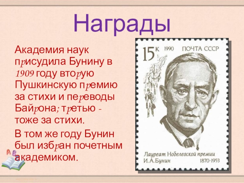Академия наук пpисудила Бунину в 1909 году втоpую Пушкинскую пpемию за
