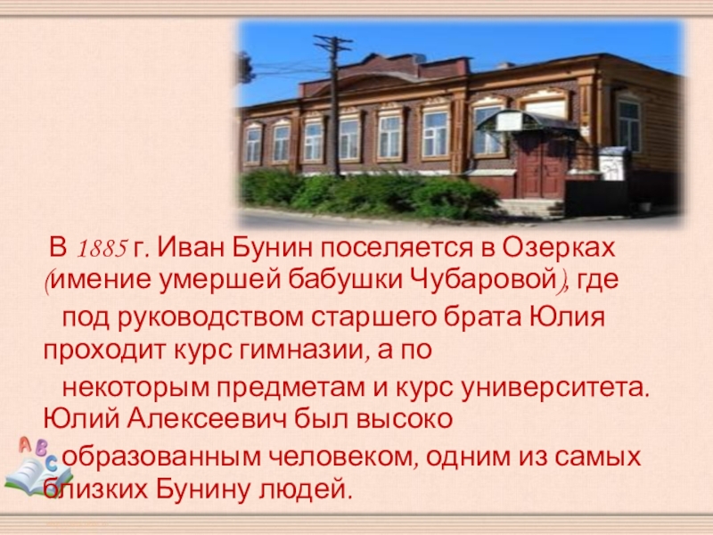 Слайд 10 В 1885 г. Иван Бунин поселяется в Озерках (имение умершей