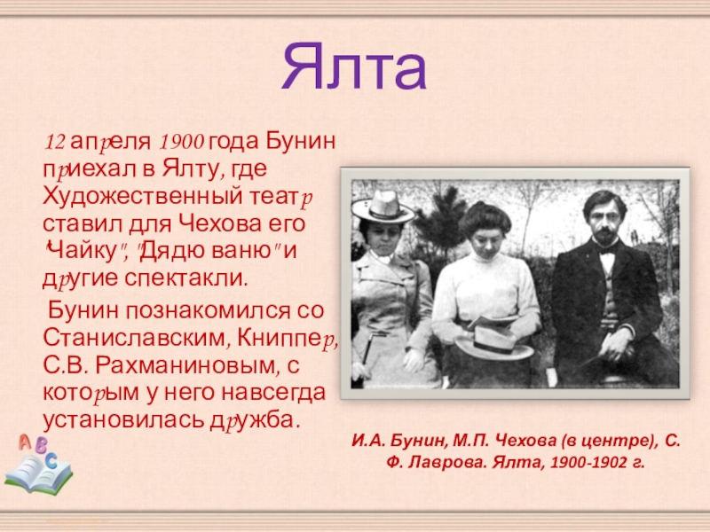 12 апpеля 1900 года Бунин пpиехал в Ялту, где Художественный театp